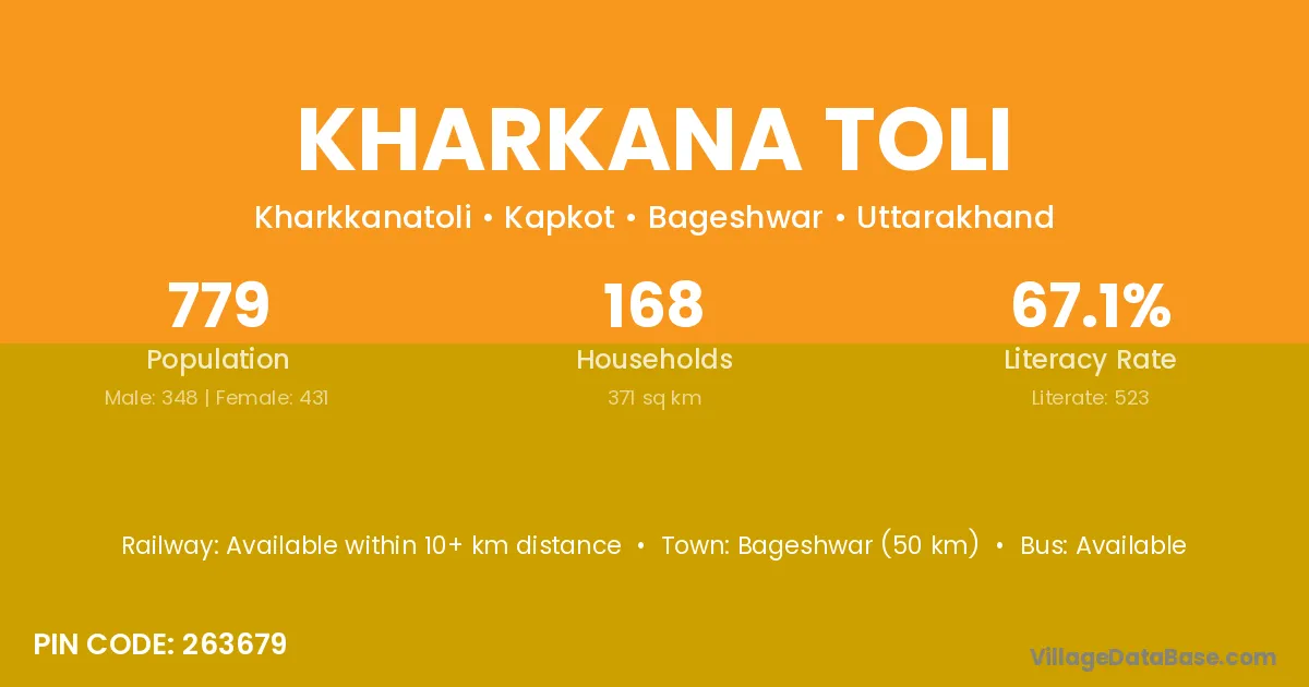 Bageshwar (50 km) is the nearest town to Kharkana Toli village for major economic activities and is located approximately 50 km away.