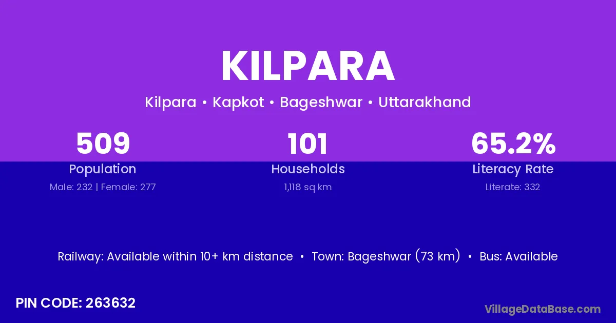 Bageshwar (73 km) is the nearest town to Kilpara village for major economic activities and is located approximately 73 km away.
