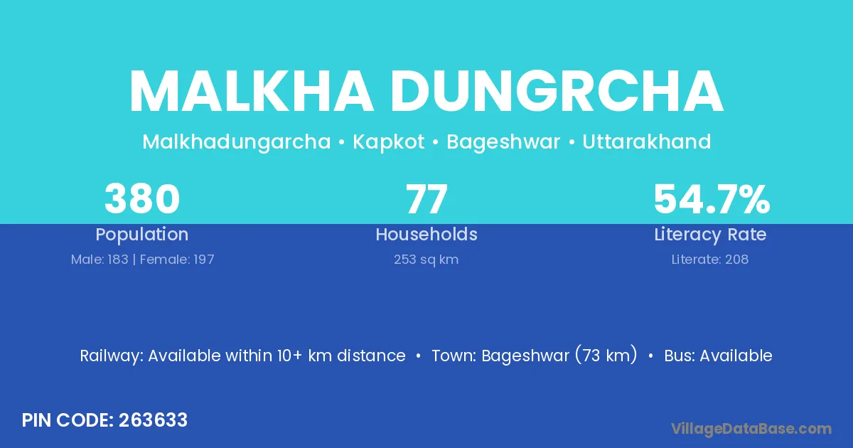 Bageshwar (73 km) is the nearest town to Malkha Dungrcha village for major economic activities and is located approximately 73 km away.