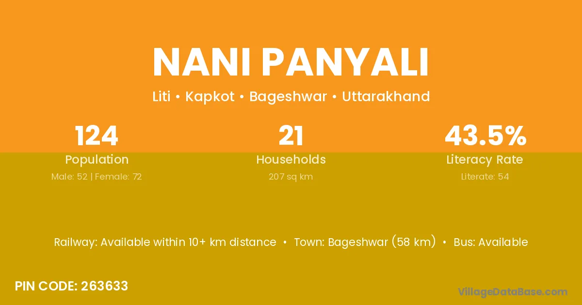 Bageshwar (58 km) is the nearest town to Nani Panyali village for major economic activities and is located approximately 58 km away.