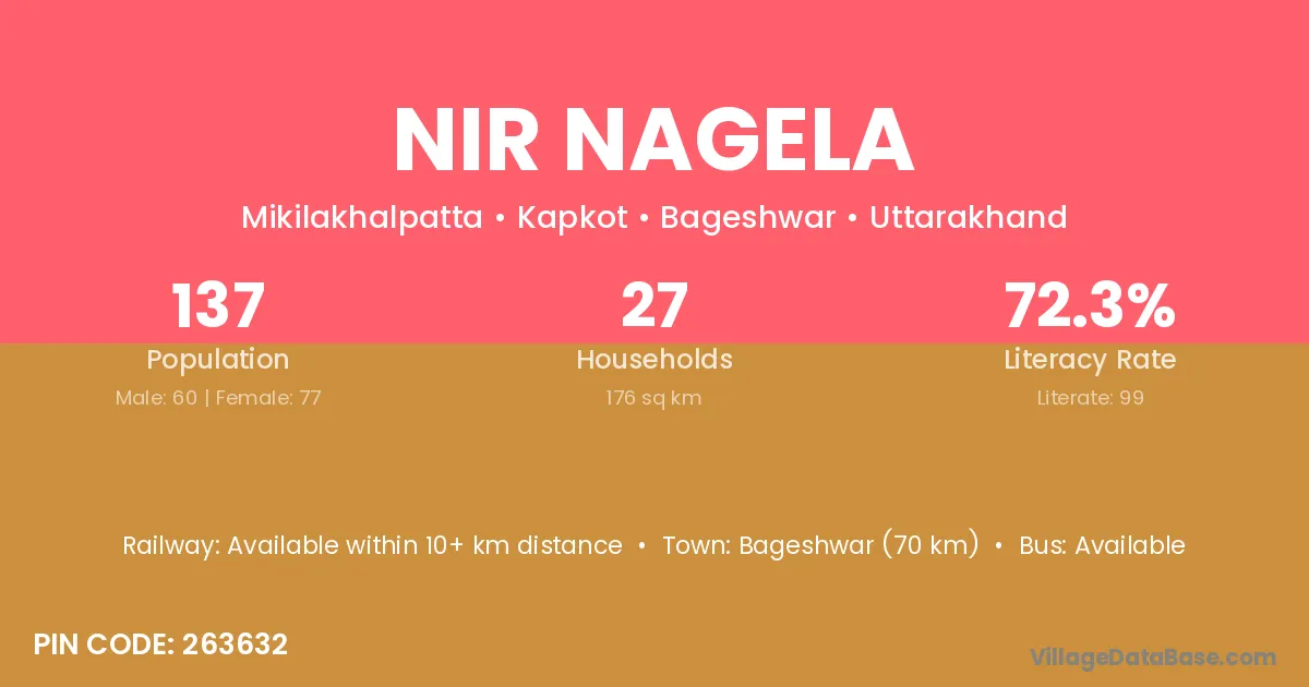 Bageshwar (70 km) is the nearest town to Nir Nagela village for major economic activities and is located approximately 70 km away.