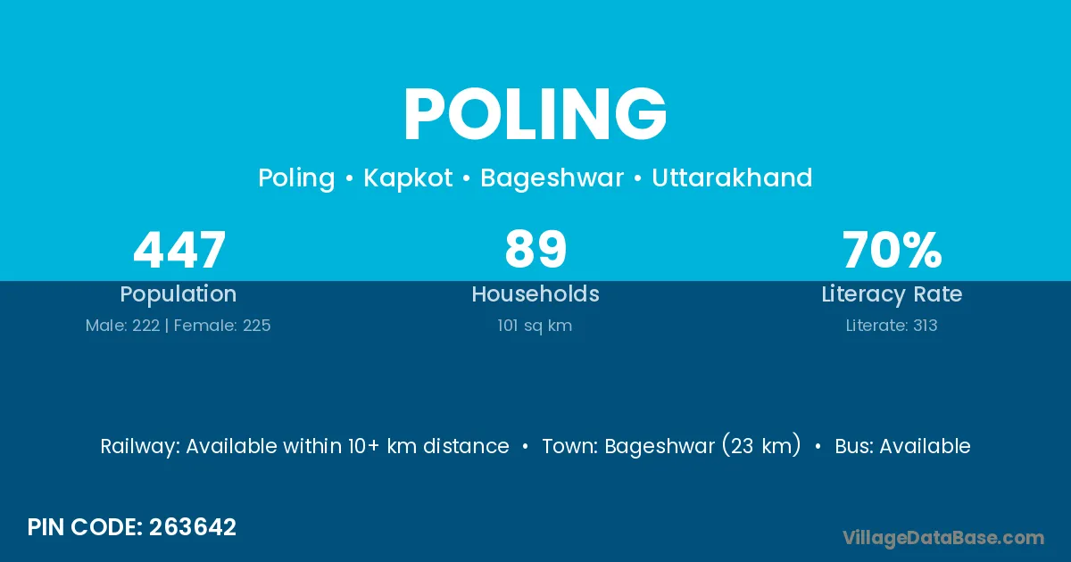 Bageshwar (23 km) is the nearest town to Poling village for major economic activities and is located approximately 23 km away.