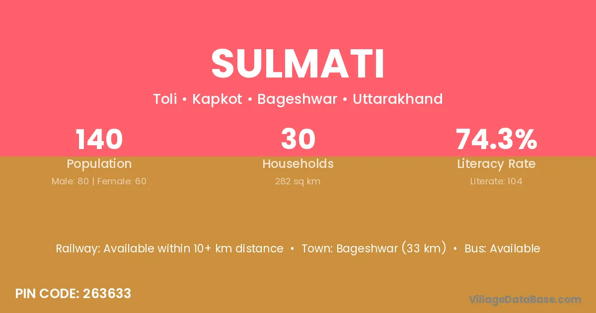 Bageshwar (33 km) is the nearest town to Sulmati village for major economic activities and is located approximately 33 km away.