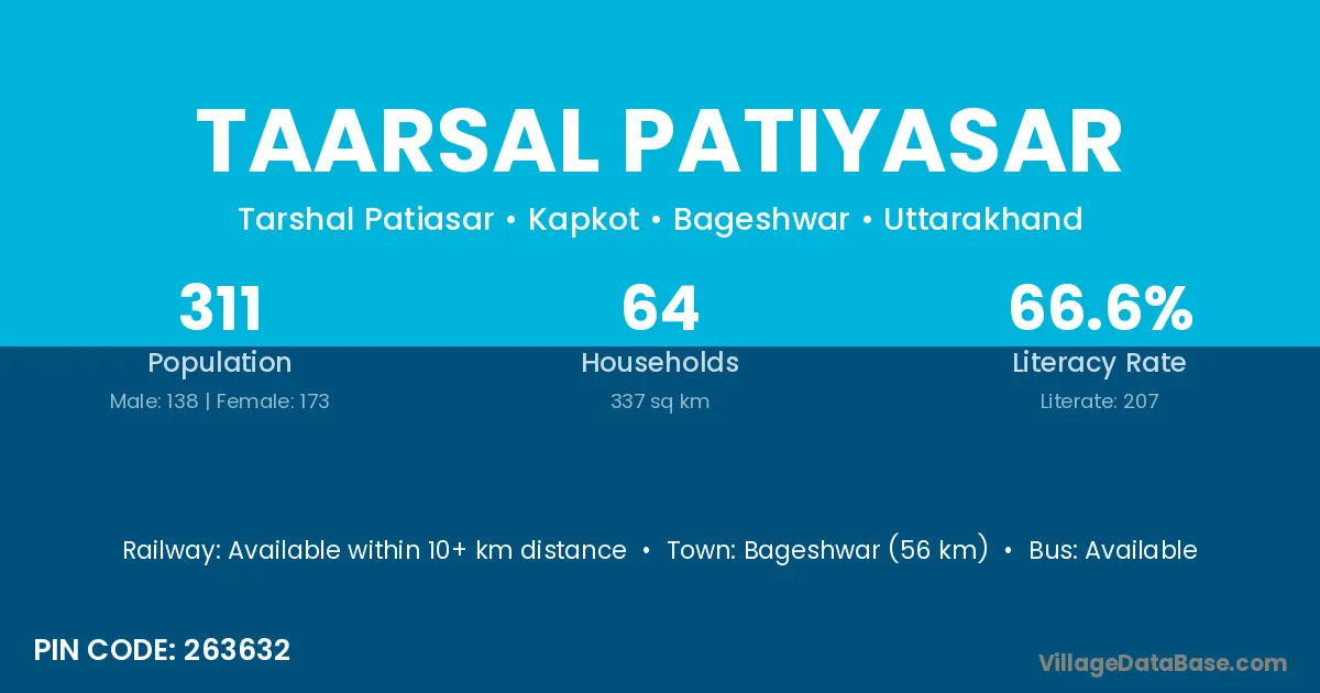 Bageshwar (56 km) is the nearest town to Taarsal Patiyasar village for major economic activities and is located approximately 56 km away.