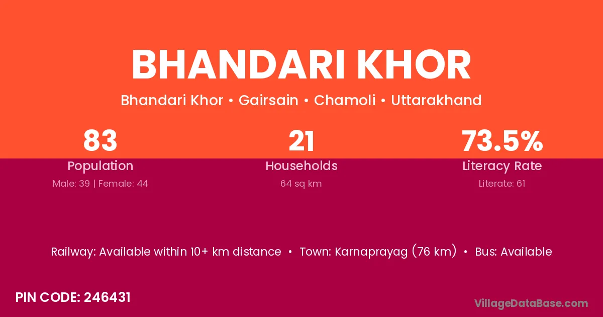 Karnaprayag (76 km) is the nearest town to Bhandari Khor village for major economic activities and is located approximately 76 km away.