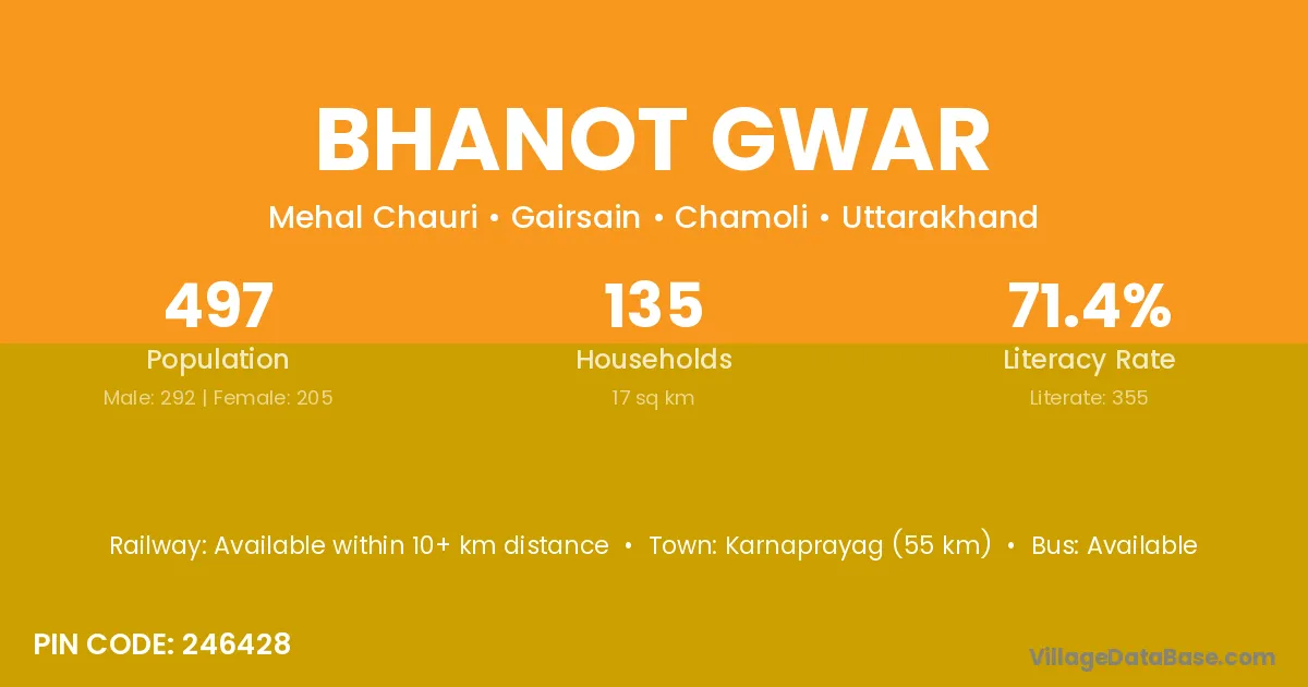 Karnaprayag (55 km) is the nearest town to Bhanot Gwar village for major economic activities and is located approximately 55 km away.