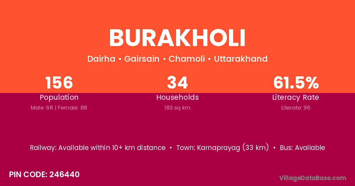 Karnaprayag (33 km) is the nearest town to Burakholi village for major economic activities and is located approximately 33 km away.