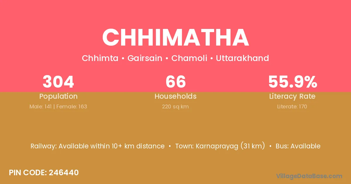 Karnaprayag (31 km) is the nearest town to Chhimatha village for major economic activities and is located approximately 31 km away.