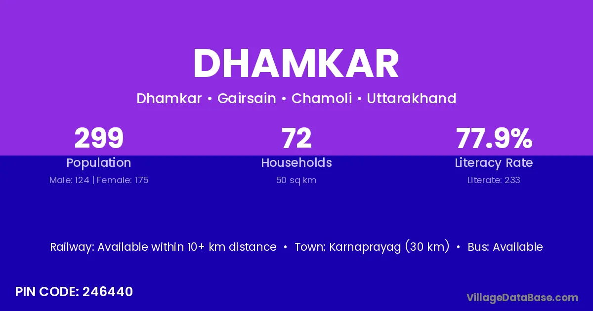 Karnaprayag (30 km) is the nearest town to Dhamkar village for major economic activities and is located approximately 30 km away.