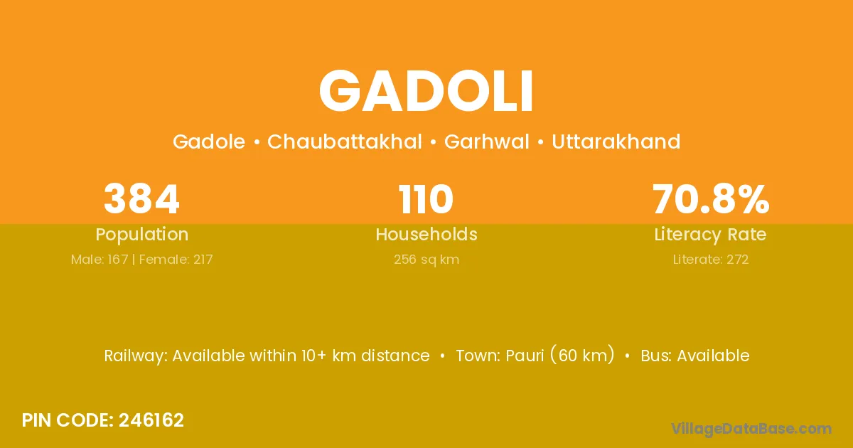 Karnaprayag (50 km) is the nearest town to Gadoli village for major economic activities and is located approximately 50 km away.