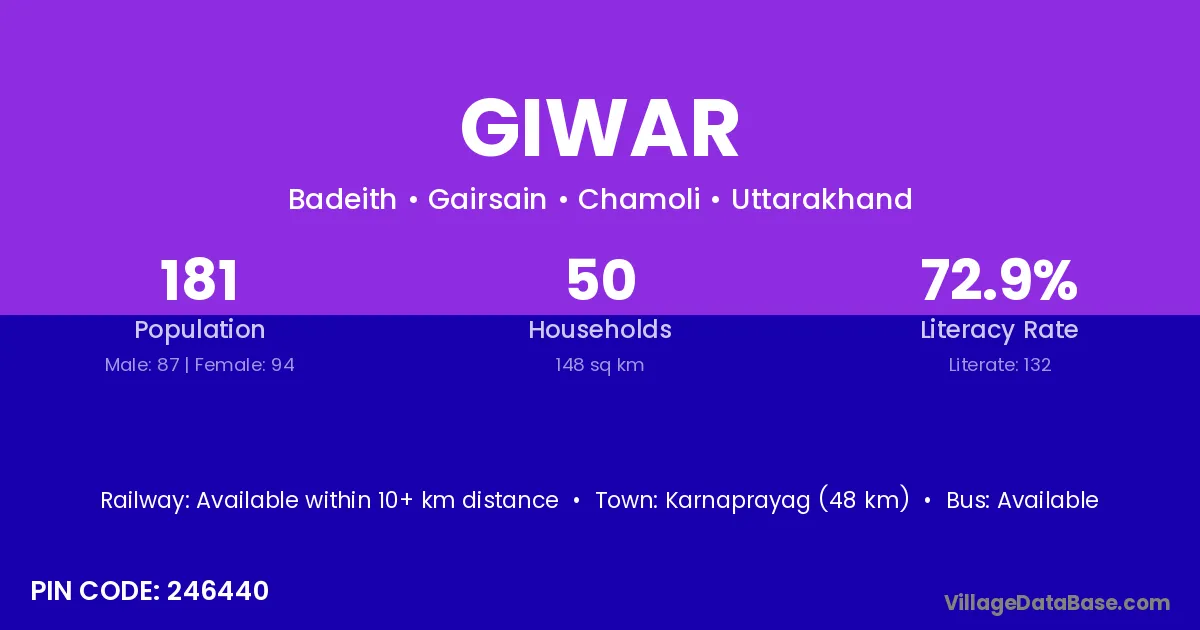 Karnaprayag (48 km) is the nearest town to Giwar village for major economic activities and is located approximately 48 km away.