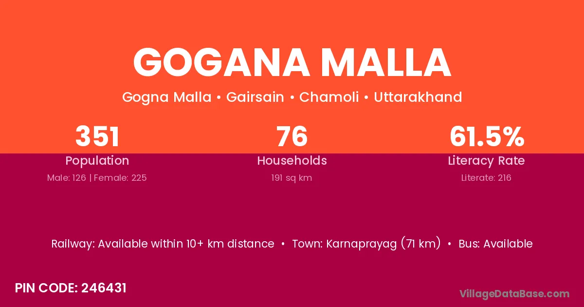 Karnaprayag (71 km) is the nearest town to Gogana Malla village for major economic activities and is located approximately 71 km away.