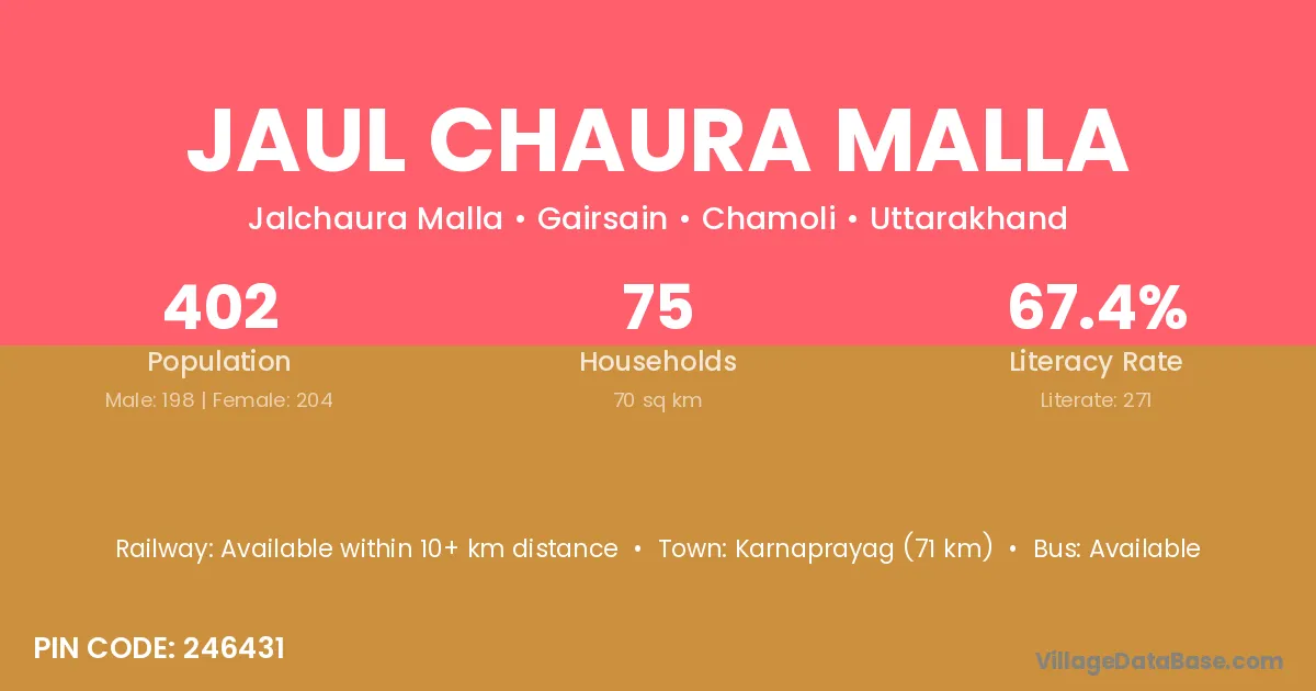 Karnaprayag (71 km) is the nearest town to Jaul Chaura Malla village for major economic activities and is located approximately 71 km away.