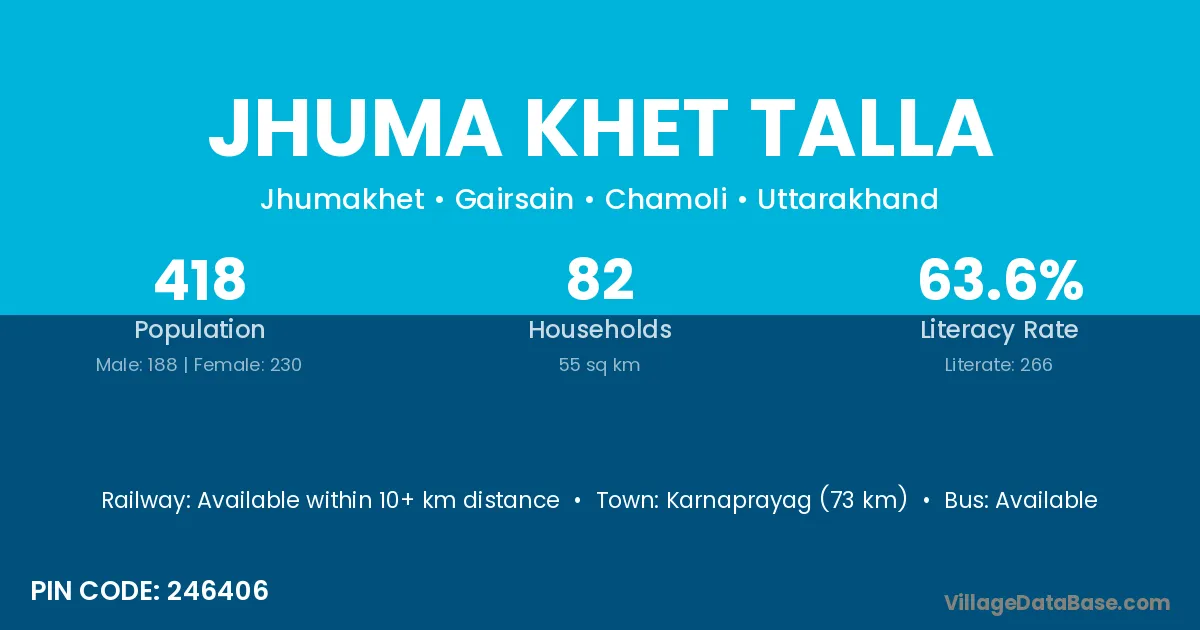 Jhuma Khet Talla village has a total population of 418 people, of which 188 are males and 230 are females.
