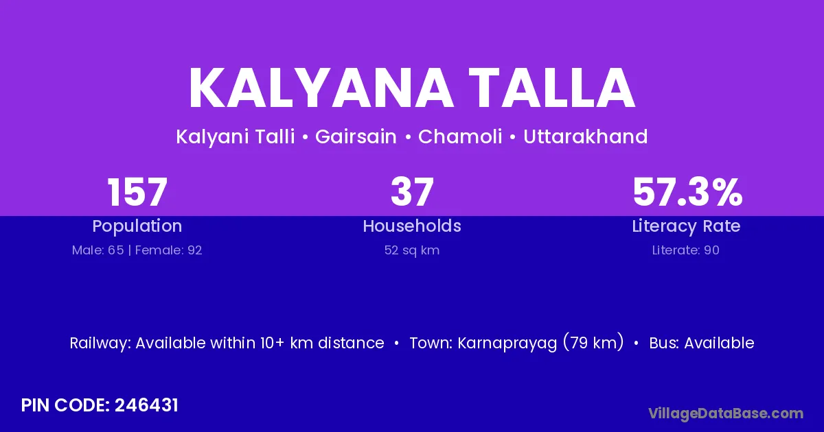 Karnaprayag (79 km) is the nearest town to Kalyana Talla village for major economic activities and is located approximately 79 km away.