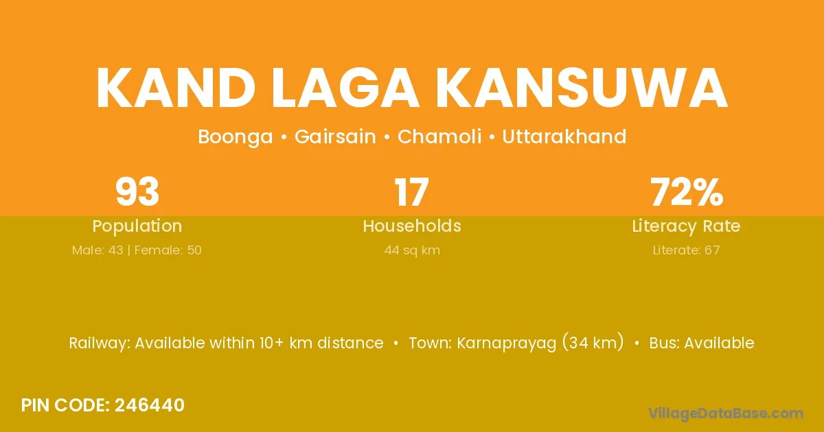 Karnaprayag (34 km) is the nearest town to Kand Laga Kansuwa village for major economic activities and is located approximately 34 km away.