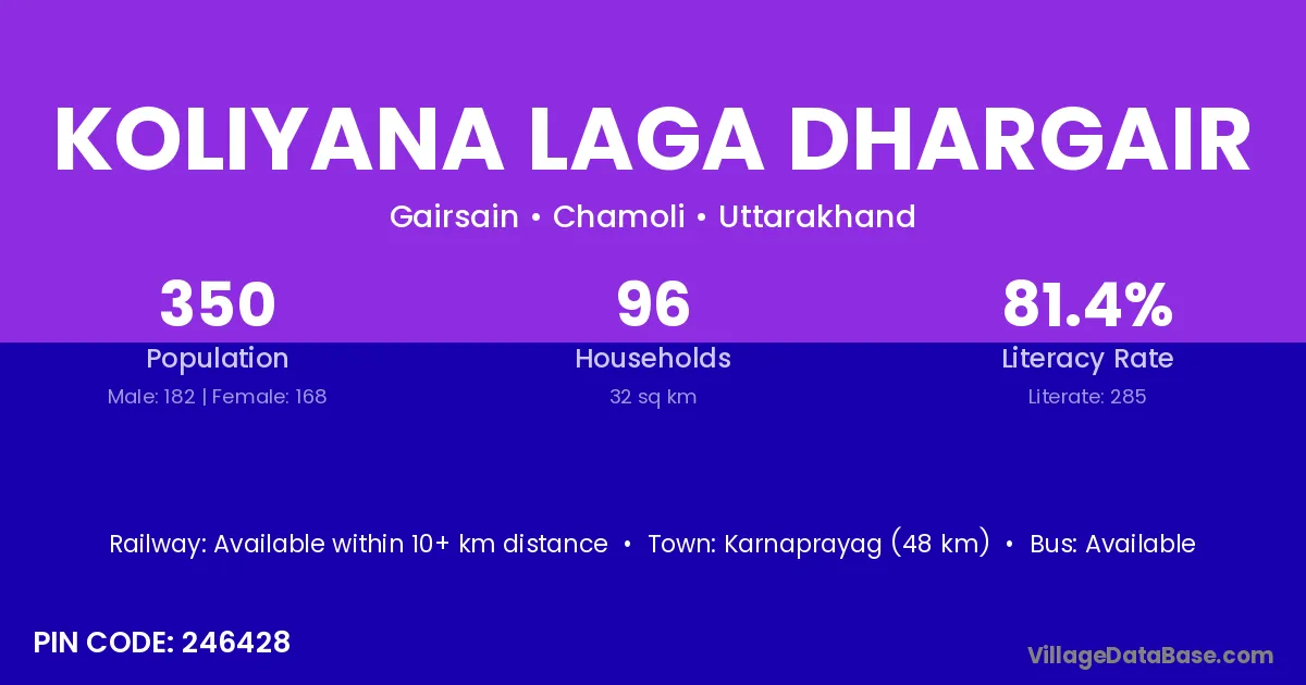 Karnaprayag (48 km) is the nearest town to Koliyana Laga Dhargair village for major economic activities and is located approximately 48 km away.