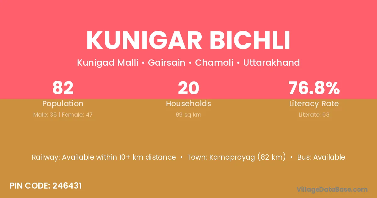 Karnaprayag (82 km) is the nearest town to Kunigar Bichli village for major economic activities and is located approximately 82 km away.