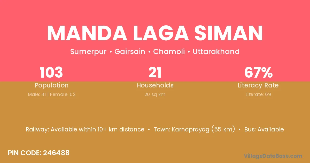 Karnaprayag (55 km) is the nearest town to Manda Laga Siman village for major economic activities and is located approximately 55 km away.