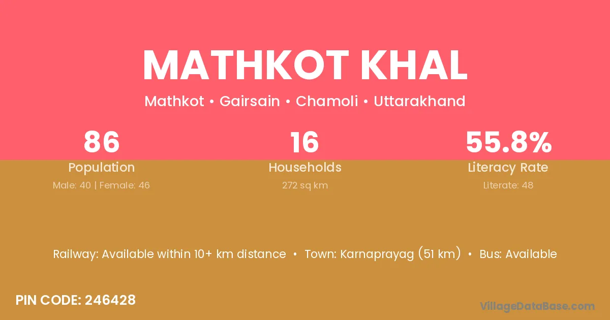 Karnaprayag (51 km) is the nearest town to Mathkot Khal village for major economic activities and is located approximately 51 km away.