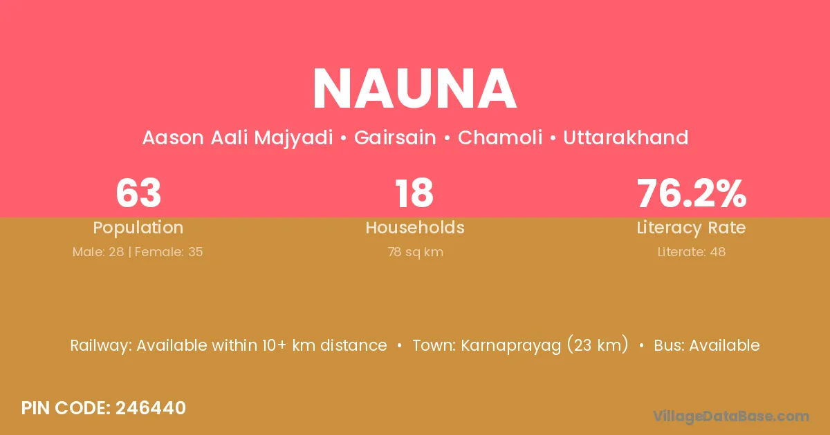 Karnaprayag (23 km) is the nearest town to Nauna village for major economic activities and is located approximately 23 km away.