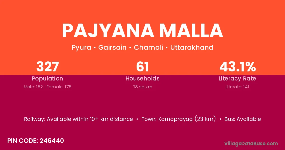 Karnaprayag (23 km) is the nearest town to Pajyana Malla village for major economic activities and is located approximately 23 km away.