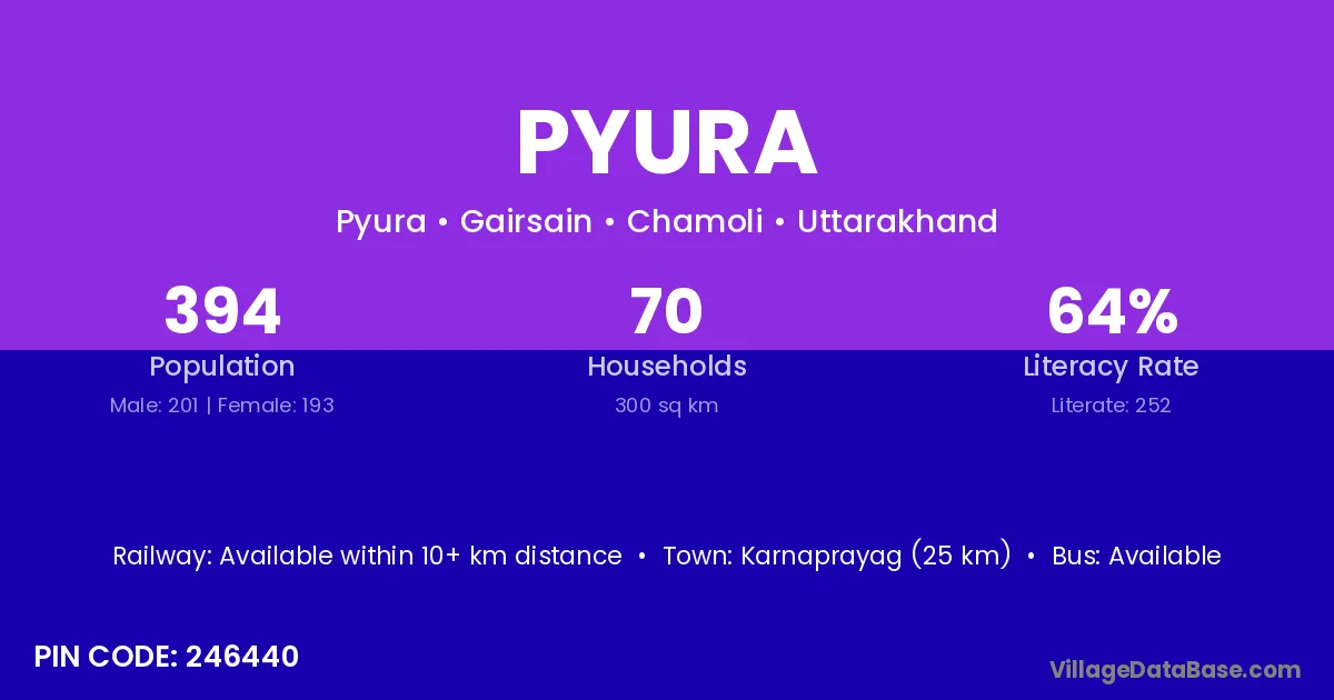 Karnaprayag (25 km) is the nearest town to Pyura village for major economic activities and is located approximately 25 km away.