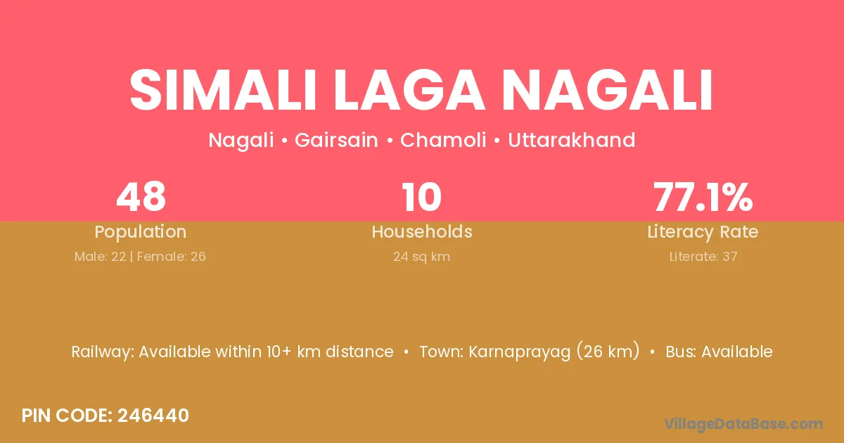 Karnaprayag (26 km) is the nearest town to Simali Laga Nagali village for major economic activities and is located approximately 26 km away.