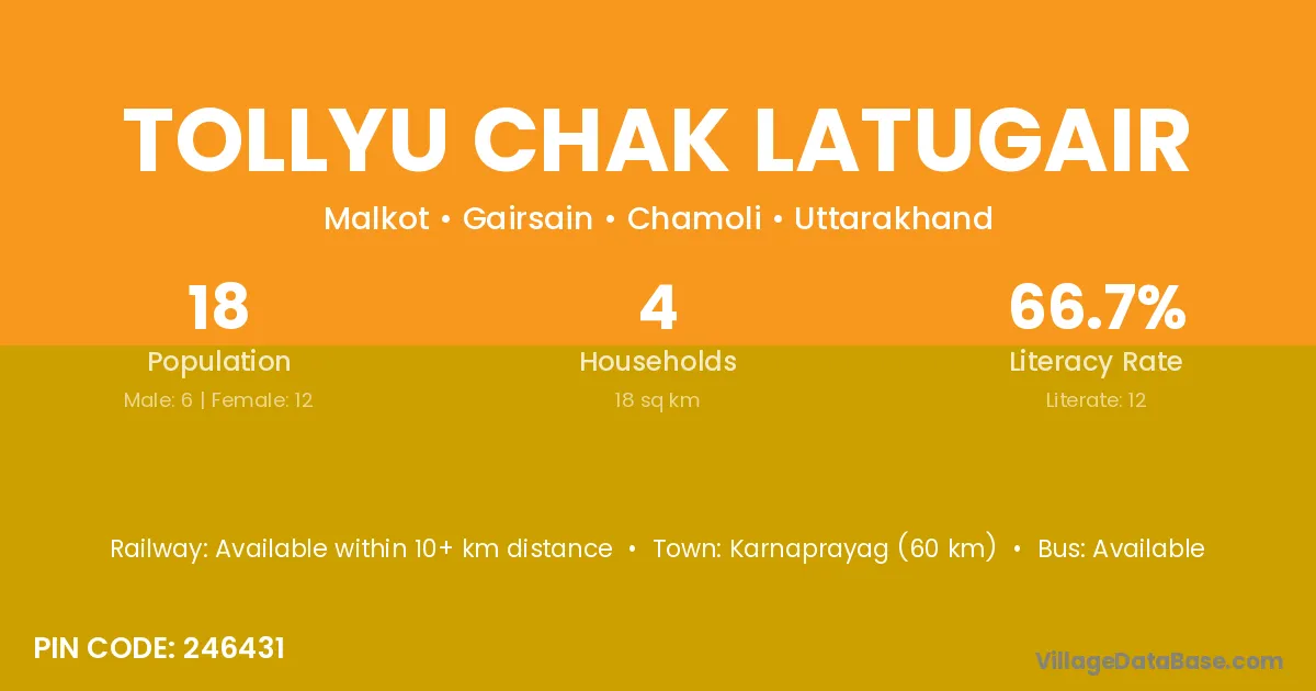 Karnaprayag (60 km) is the nearest town to Tollyu Chak Latugair village for major economic activities and is located approximately 60 km away.