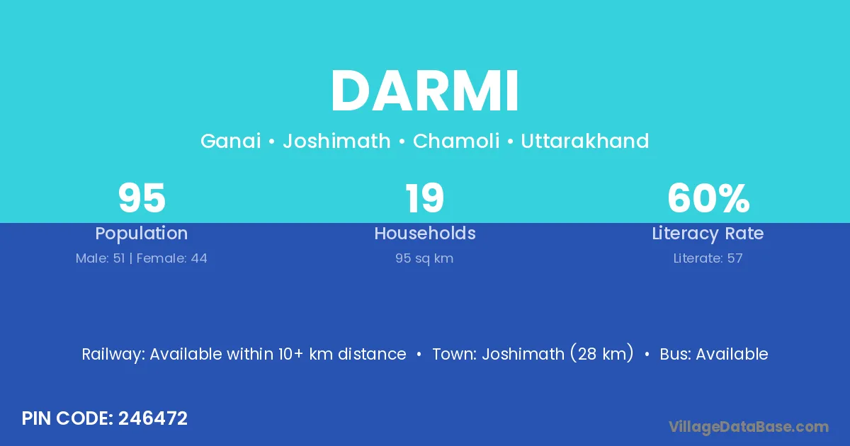 Joshimath (28 km) is the nearest town to Darmi village for major economic activities and is located approximately 28 km away.