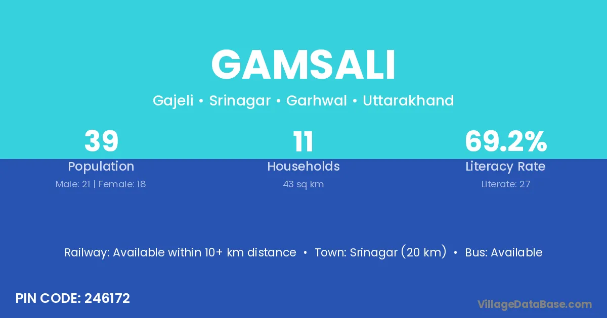 Joshimath (85 km) is the nearest town to Gamsali village for major economic activities and is located approximately 85 km away.