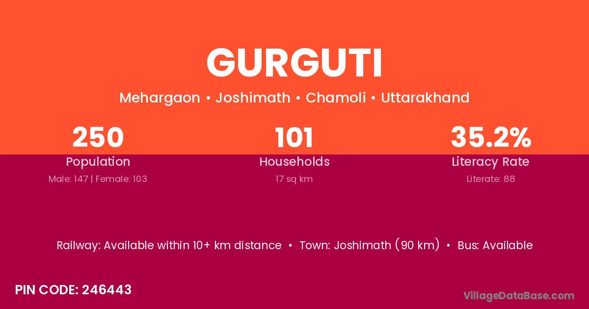 Joshimath (90 km) is the nearest town to Gurguti village for major economic activities and is located approximately 90 km away.