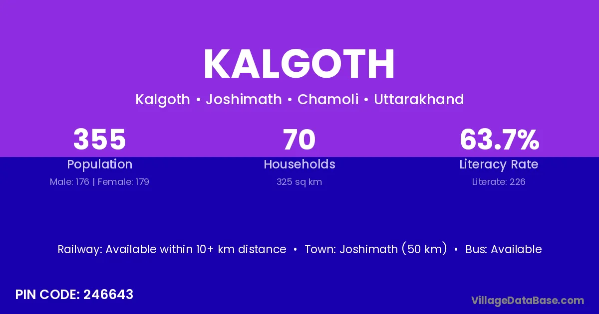 Joshimath (50 km) is the nearest town to Kalgoth village for major economic activities and is located approximately 50 km away.