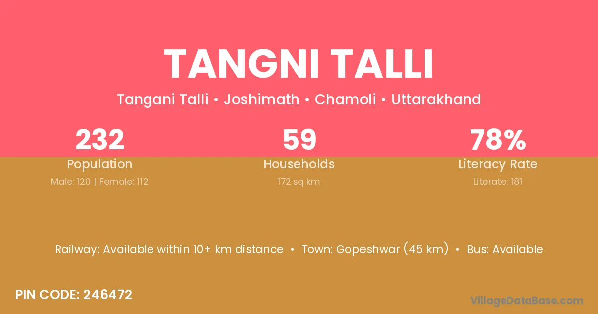 Gopeshwar (45 km) is the nearest town to Tangni Talli village for major economic activities and is located approximately 45 km away.