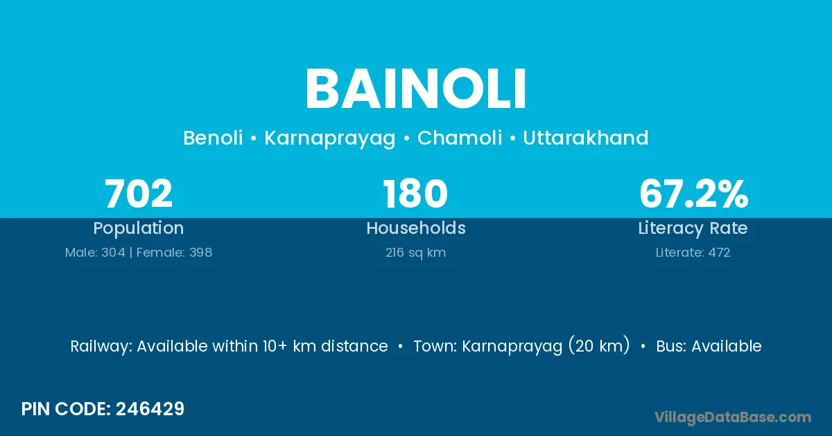 Karnaprayag (20 km) is the nearest town to Bainoli village for major economic activities and is located approximately 20 km away.