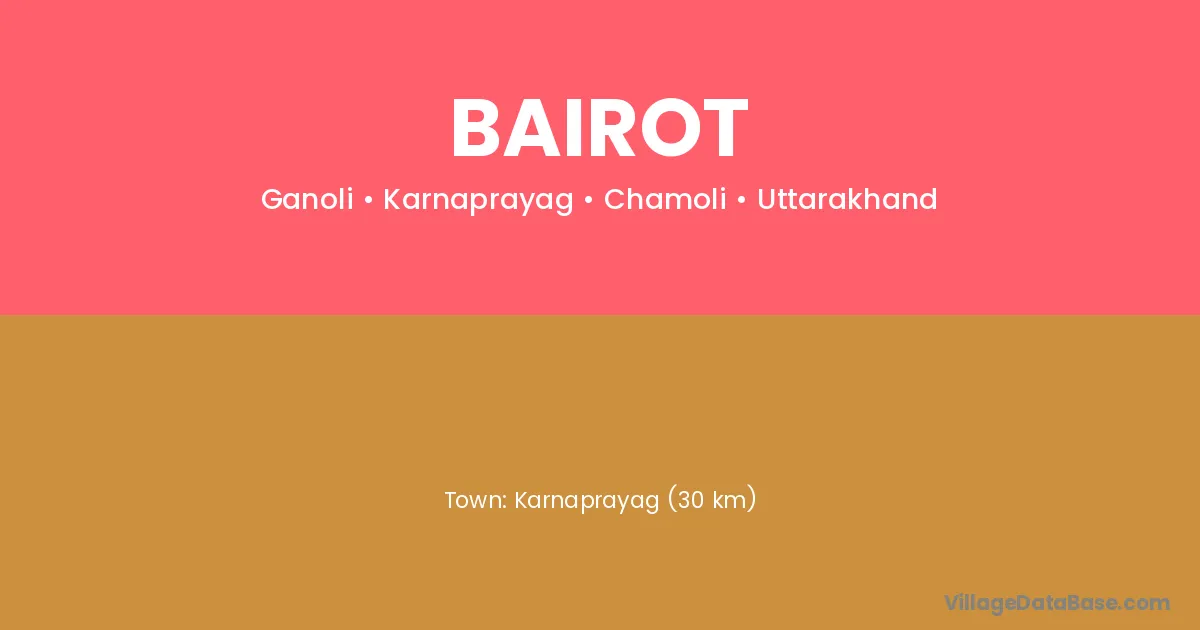 Karnaprayag (30 km) is the nearest town to Bairot village for major economic activities and is located approximately 30 km away.