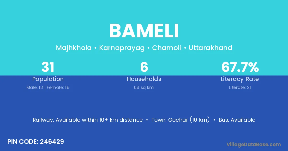Gochar (10 km) is the nearest town to Bameli village for major economic activities and is located approximately 10 km away.