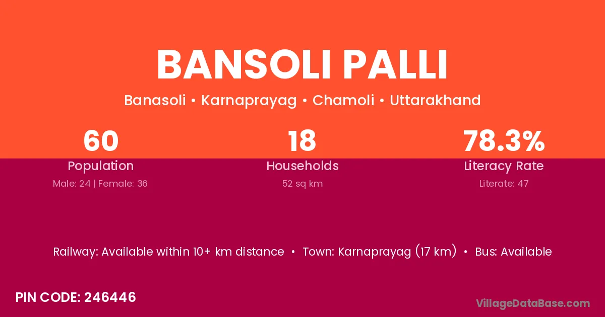 Karnaprayag (17 km) is the nearest town to Bansoli Palli village for major economic activities and is located approximately 17 km away.
