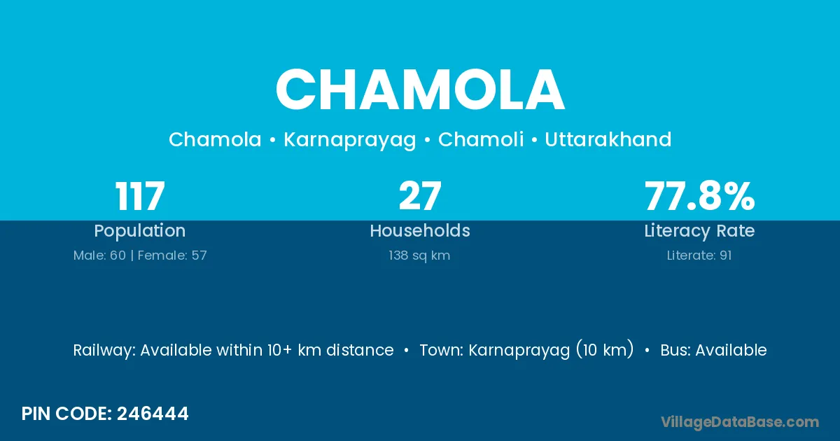 Karnaprayag (10 km) is the nearest town to Chamola village for major economic activities and is located approximately 10 km away.