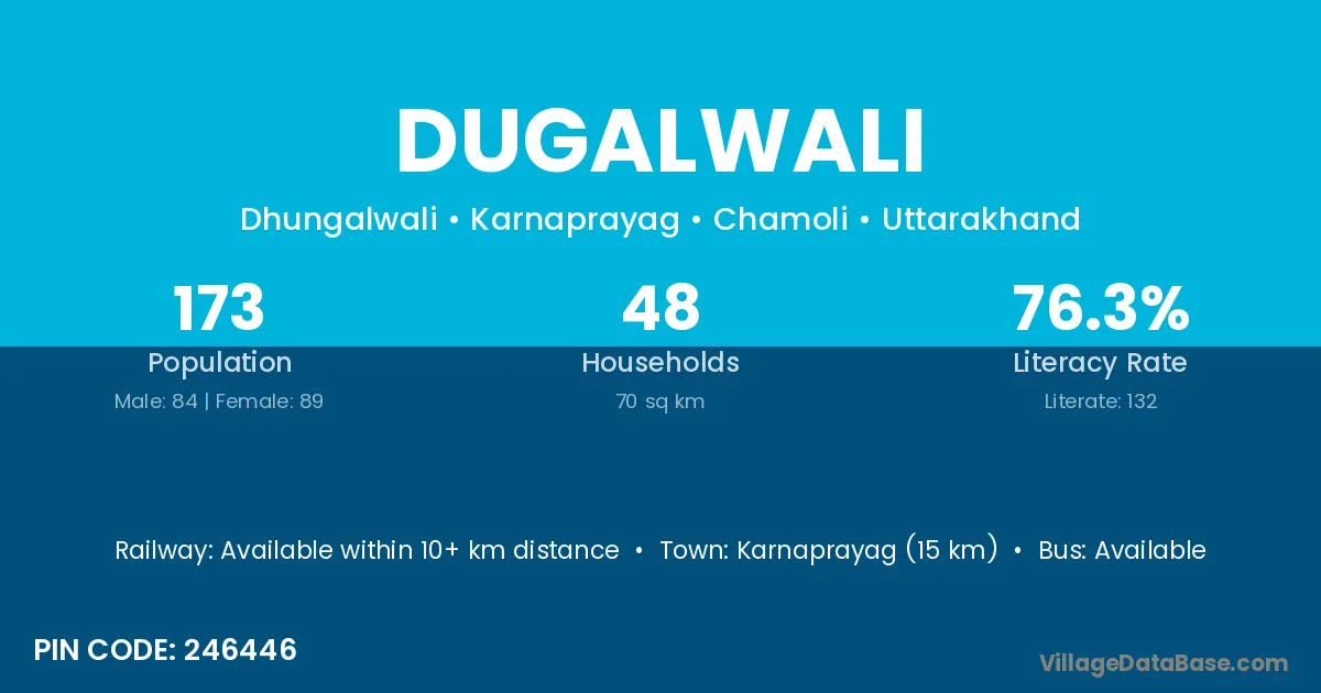 Karnaprayag (15 km) is the nearest town to Dugalwali village for major economic activities and is located approximately 15 km away.