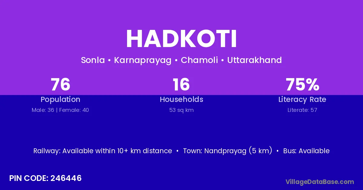 Nandprayag (5 km) is the nearest town to Hadkoti village for major economic activities and is located approximately 5 km away.