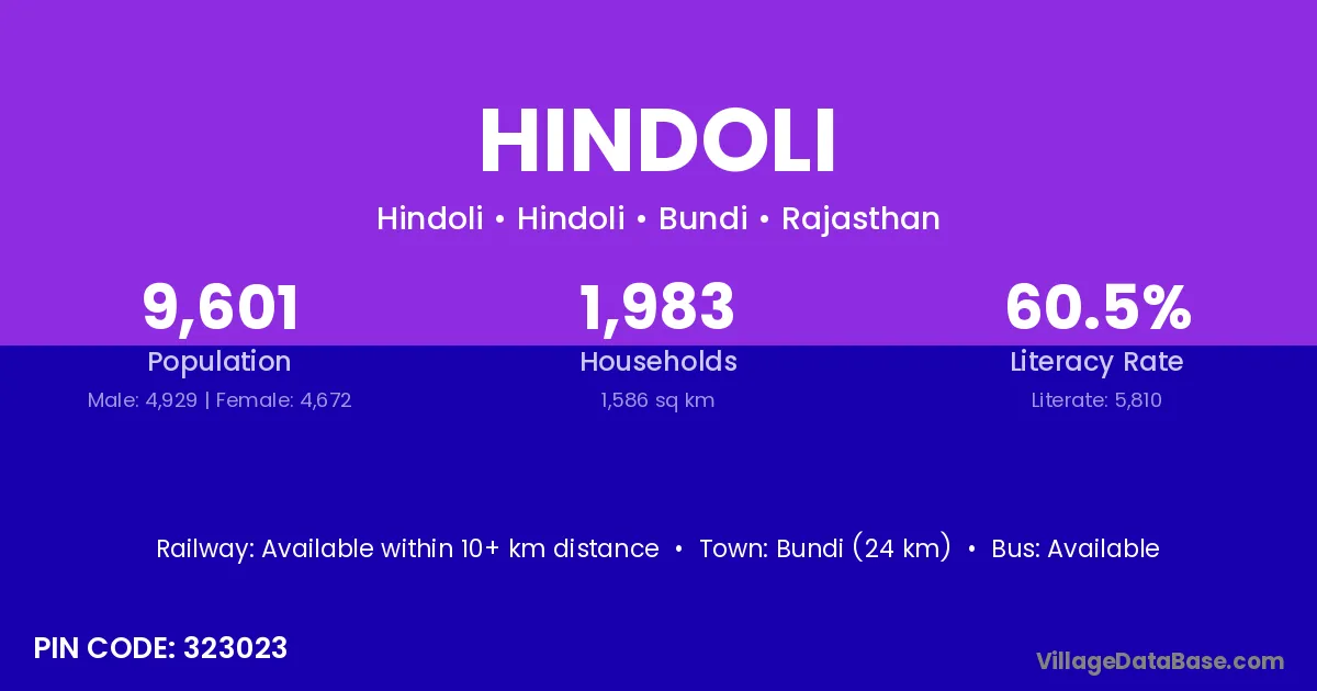 The literacy rate of Hindoli village is 79.31%. Male literacy stands at 89.47% and female literacy at 71.43%.