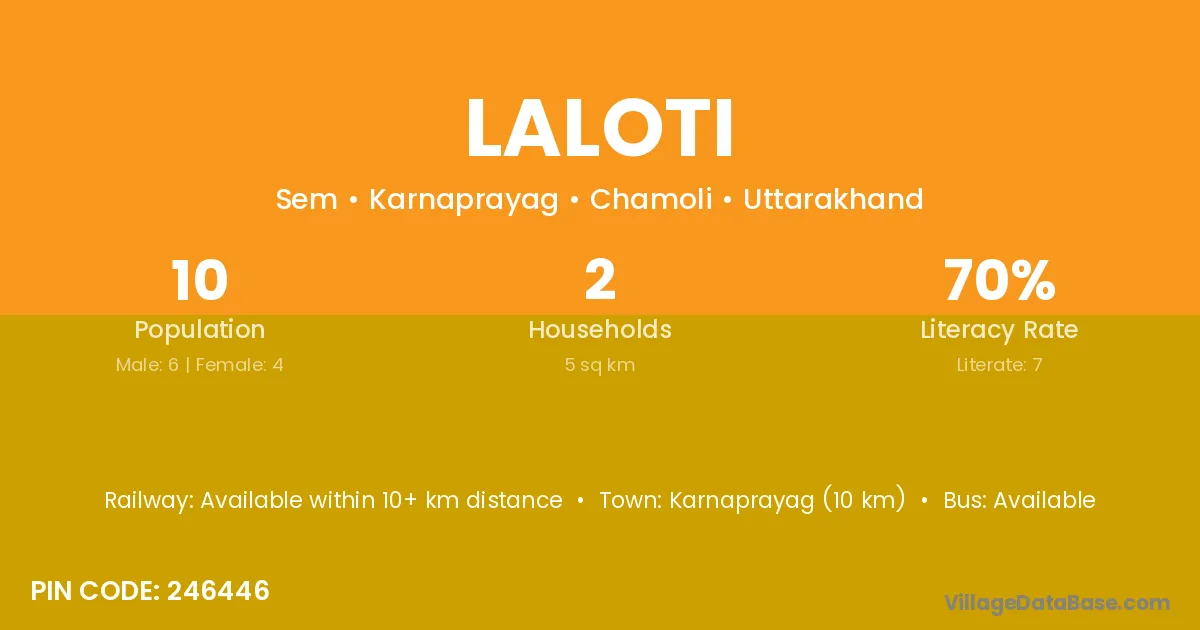 Karnaprayag (10 km) is the nearest town to Laloti village for major economic activities and is located approximately 10 km away.