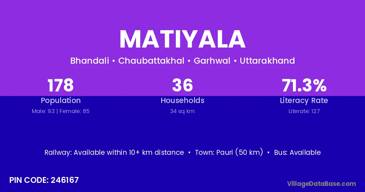 Karnaprayag (18 km) is the nearest town to Matiyala village for major economic activities and is located approximately 18 km away.