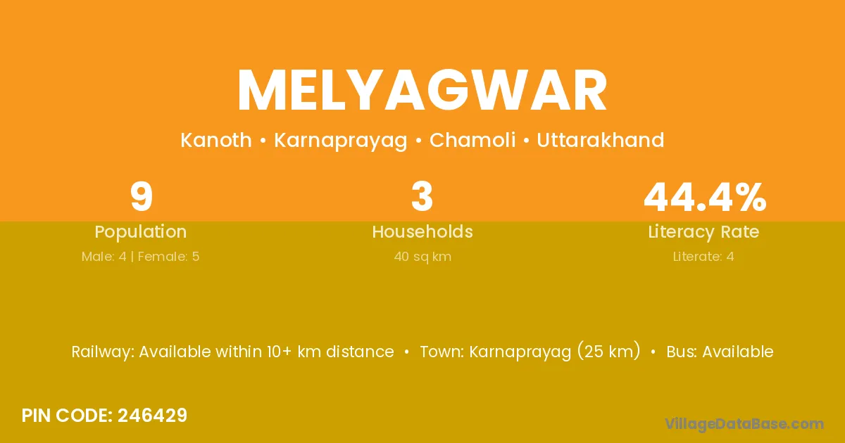 Karnaprayag (25 km) is the nearest town to Melyagwar village for major economic activities and is located approximately 25 km away.