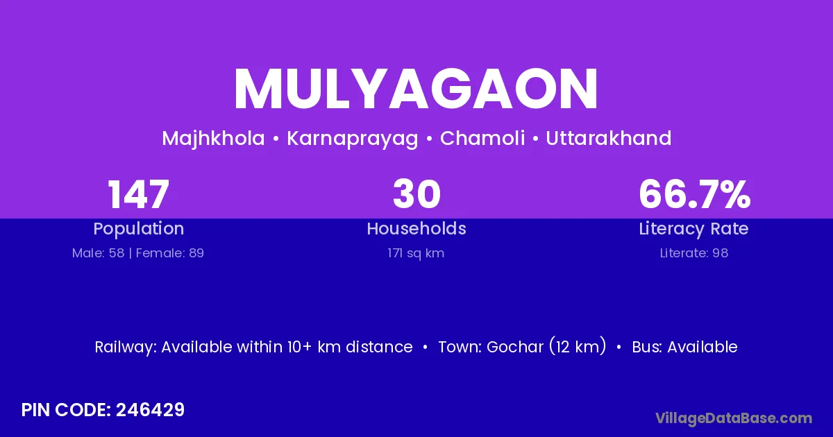Gochar (12 km) is the nearest town to Mulyagaon village for major economic activities and is located approximately 12 km away.