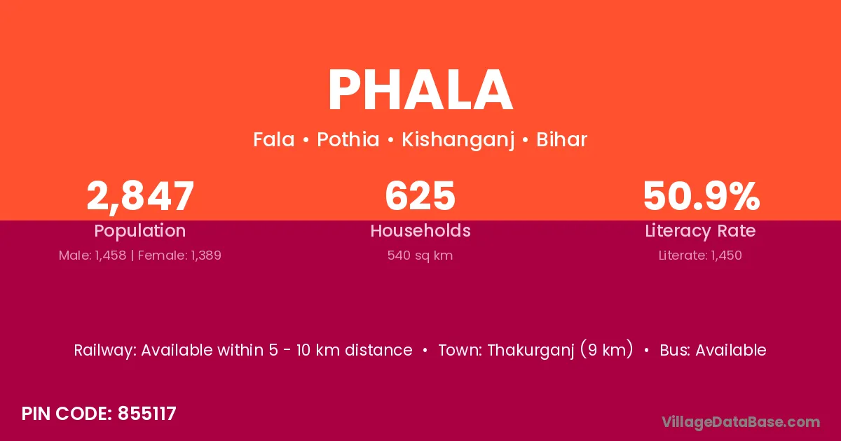 The literacy rate of Phala village is 69.23%. Male literacy stands at 80.95% and female literacy at 55.56%.