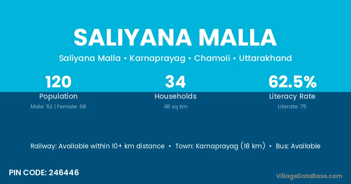 Karnaprayag (18 km) is the nearest town to Saliyana Malla village for major economic activities and is located approximately 18 km away.