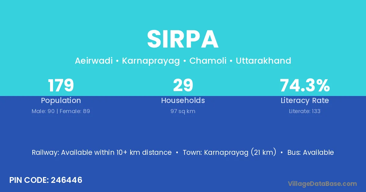 Karnaprayag (21 km) is the nearest town to Sirpa village for major economic activities and is located approximately 21 km away.