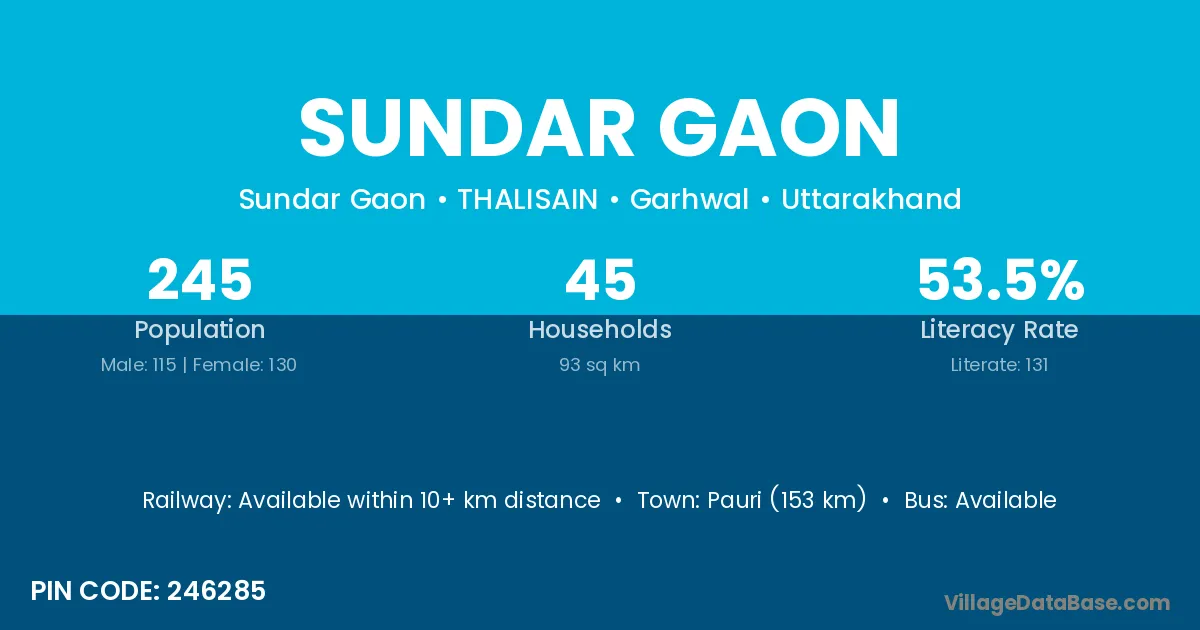 Karnaprayag (7 km) is the nearest town to Sundar Gaon village for major economic activities and is located approximately 7 km away.